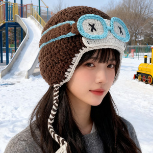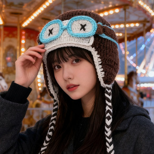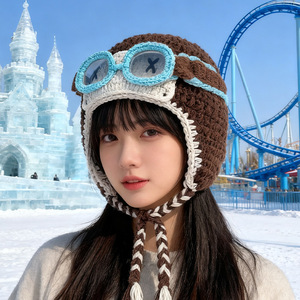 檀健次同款眼镜可拆卸毛线帽子女搞怪显脸小飞行帽护耳针织雷锋帽