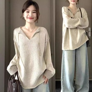 美式复古针织衫女秋季新款宽松慵懒风v领长袖毛衣显瘦设计感上衣