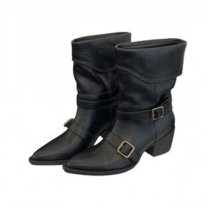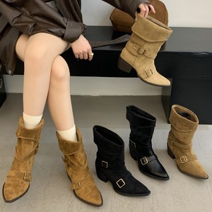 复古尖头粗跟西部靴女2025新款时尚显瘦皮带扣堆堆翻折马丁靴