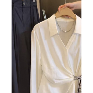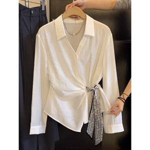 2025秋季新款韩版气质百搭斜襟丝巾绑带polo领长袖V领白衬衫7098
