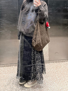 日系设计感不规则撞色格纹碎花牛仔拼接半身裙秋冬新款高腰a字裙