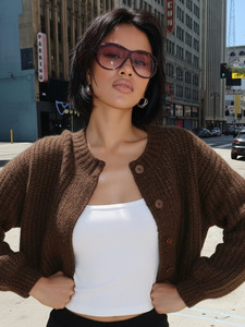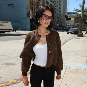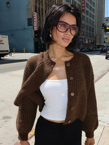 欧美慵懒风休闲舒适纯色基础复古毛织开衫时尚圆领百搭长袖外套