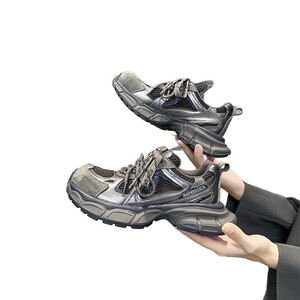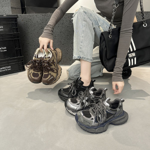 2025新款真皮厚底老爹鞋女银色透气休闲运动鞋百搭增高松糕鞋女鞋