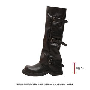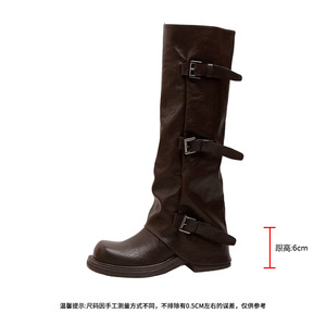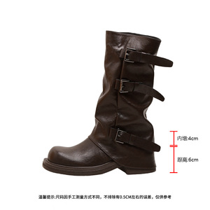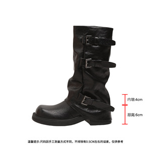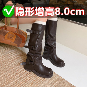 增高8cm~葡萄妈款皮带扣方圆头褶皱中筒骑士西部褶皱堆堆裤管女靴