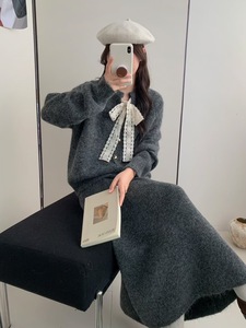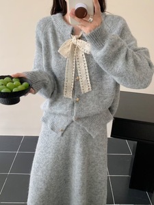 设计感系带毛衣开衫+半身长裙套装女秋冬新款宽松慵懒针织两件套