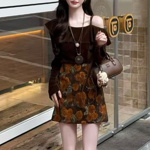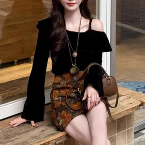 时尚设计感斜肩长袖荷叶边丝绒上衣女2025新款露肩打底衫T恤套装
