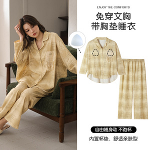 栗茵春秋季带胸垫奥力棉女士长袖长裤睡衣可外出小众家居服套装