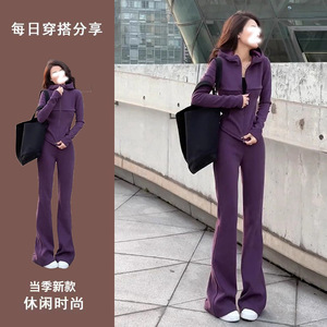 2025新款紫色休闲运动套装女秋冬洋气修身显瘦连帽微喇裤两件套