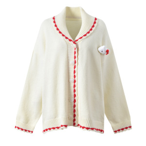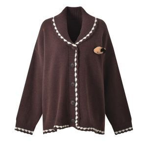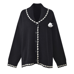 2025秋季新款时尚百搭立体卡通装饰翻领落肩袖宽松针织开衫上衣