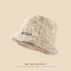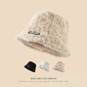 秋冬款仿兔毛黑标字母渔夫帽女水桶帽潮流款时尚百搭毛绒保暖盆帽