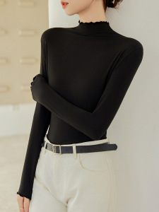 萝卜大叔木耳边设计半高领打底衫女秋冬保暖上衣纯色修身长袖T恤