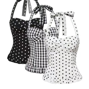 新款女法式波点印花辣妹挂脖绑带吊带背心女纯欲公主风收腰上衣