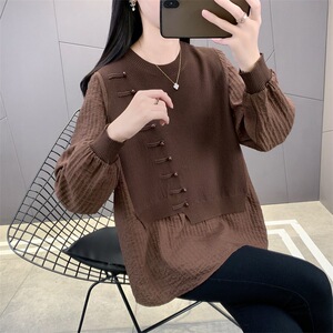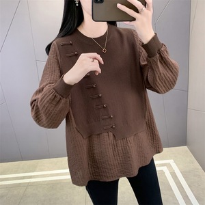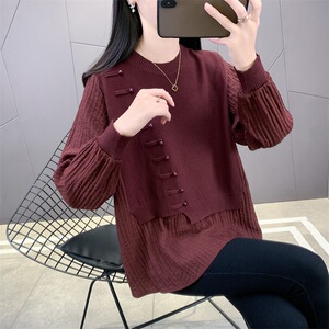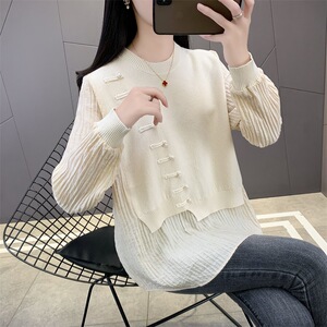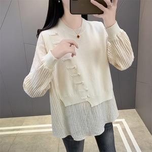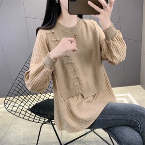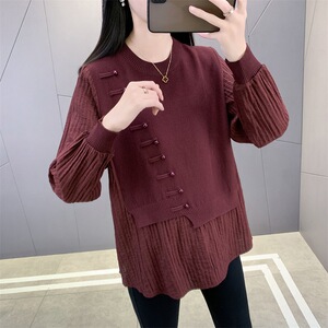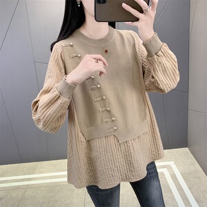 国风新中式假两件上衣女秋季新款宽松遮肉打底衫显瘦外穿针织衫