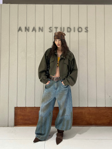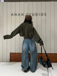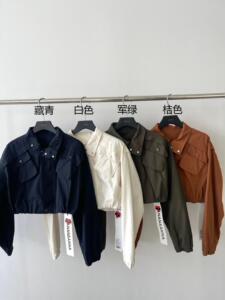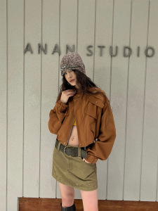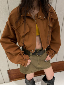 2025秋潮流时尚侧口袋立领抽褶收腰短款夹克外套蝙蝠袖夹克85121