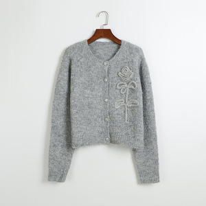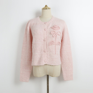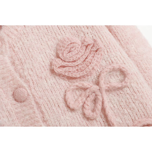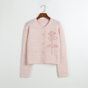 秋冬新款圆领针织开衫单排扣立体花朵刺绣甜美清新风超温柔毛衣