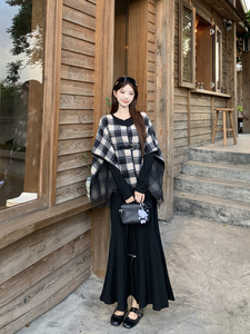 大码胖mm一整套入冬穿搭2025新款复古格子针织披肩斗篷连衣裙套装