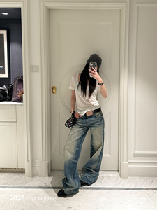 SUNONEONE 直筒阔腿裤水洗牛仔裤女美式磨白复古蓝色宽松低腰裤子