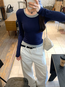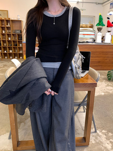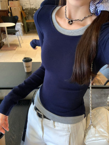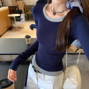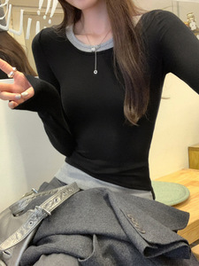 设计感撞色假两件长袖T恤女秋季2025新款修身显瘦内搭打底衫上衣