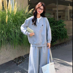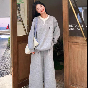 韩版休闲运动休闲套装女春秋季假两件圆领卫衣阔腿长裤宽松两件套