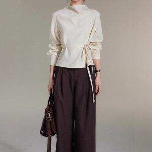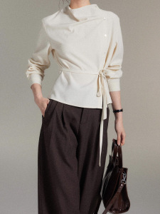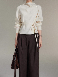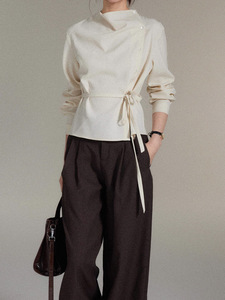设计【时宜】简约不对称荡领斜门襟绑带收腰上衣女高级感衬衫