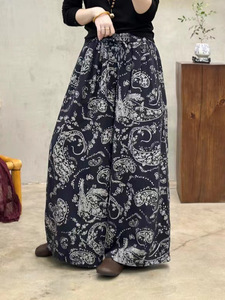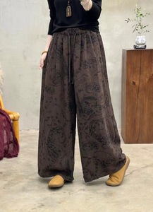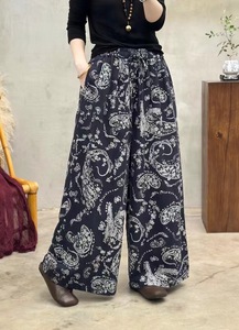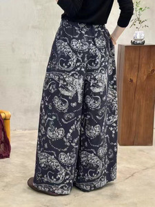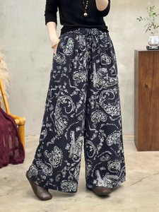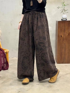 古咖服饰2025秋季复古雨露亚麻印花阔腿裤女式松紧腰系带宽松长裤