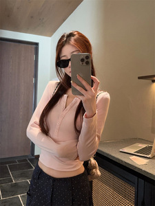 粉色长袖小众半开领短款T恤女秋季韩系甜辣妹修身显瘦内搭打底衫