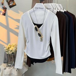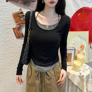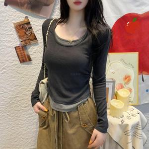 2025新款秋季撞色假两件长袖圆领设计感百搭打底衫女上衣