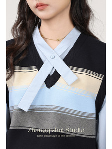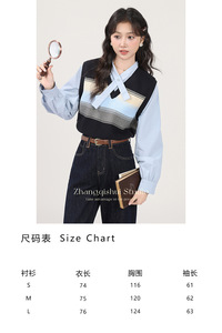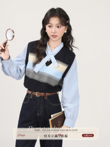 张汽水《海南之谜》秋季新款拼接假两件衬衫女蓝色气质长袖短上衣