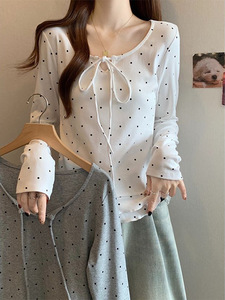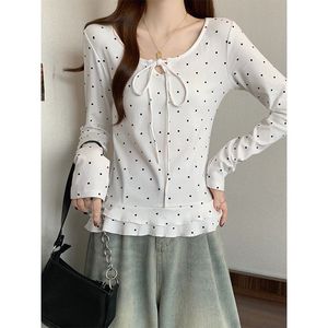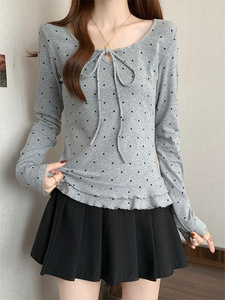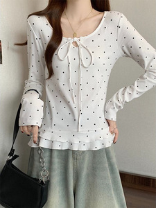 2025年早秋新款少女风波点系带木耳边圆领长袖T恤女时尚修身上衣