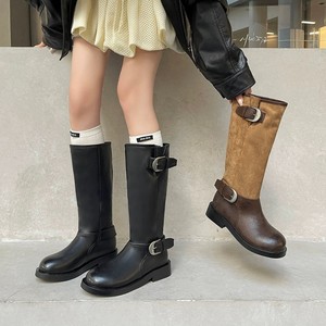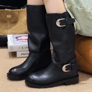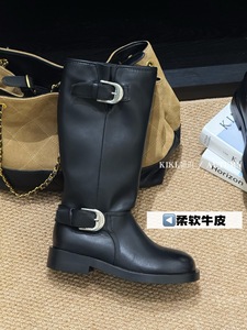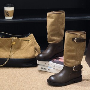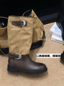 【董洁同款】皱褶堆堆靴中筒靴女真皮复古长靴子圆头拼接骑士靴子