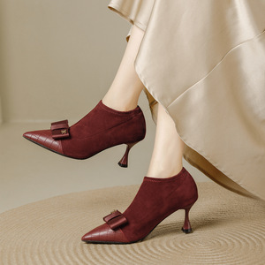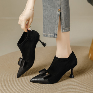 尖头蝴蝶结拼接单鞋女秋冬季新款绒面细跟尖头弹力气质深口高跟鞋
