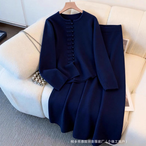 新中式国风针织套装优雅长袖秋冬新款气质减龄长裙毛衣两件套女