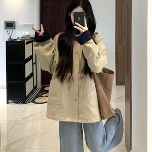 厂家直销韩系春秋外套2025新款复古拼接撞色卡其色短款风衣