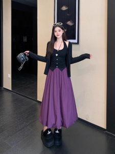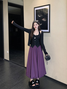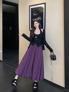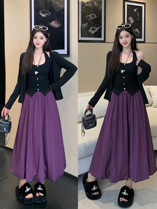 2025秋装新款胖mm大码女时尚纯欲挂脖背心开衫外套花苞裙套装