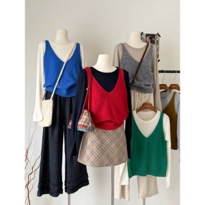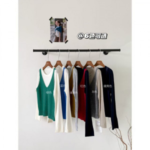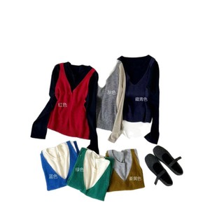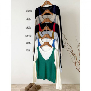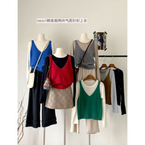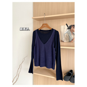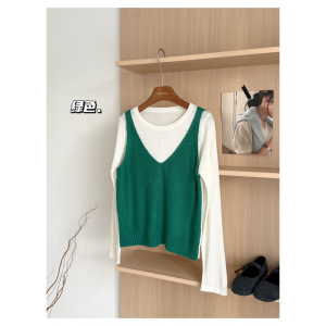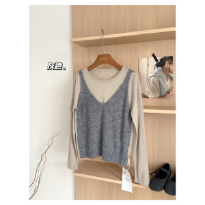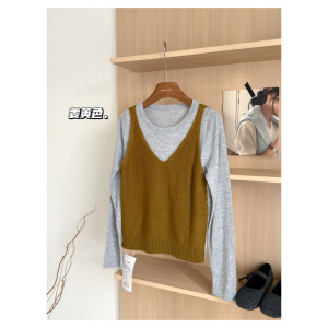 2025早秋新款韩系假两件气质针织上衣女马甲拼接长袖宽松显瘦T恤