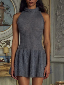 简约跨境女装纯色修身毛边无袖针织连衣裙气质半高领毛衣短裙新款