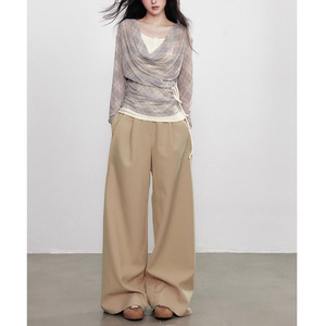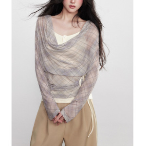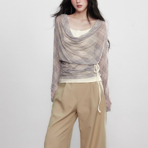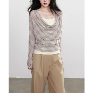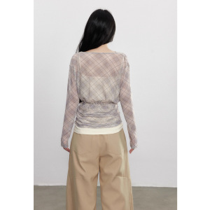 小众格子高ji感简约荡领上衣秋季收腰设计通勤气质长袖假两件女装