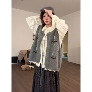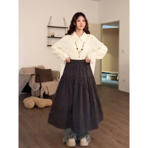 韩系学院风休闲灰色针织马甲+长袖衬衫+高腰格子半身裙女三件套装