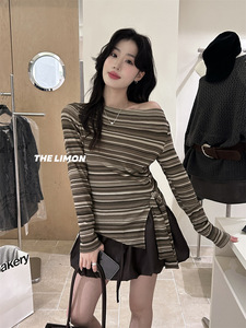 THE LIMON柠檬绿茶2025秋季撞色条纹不规则绑带一字肩针织衫上衣