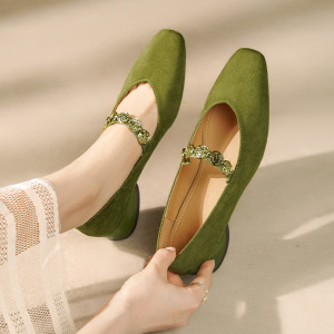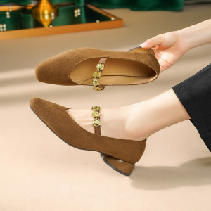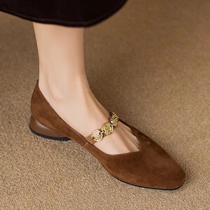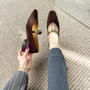 现货方头金币链玛丽珍鞋女2025新款复古法式舒适百搭低跟粗跟单鞋