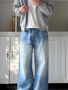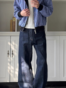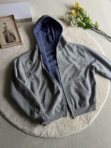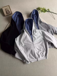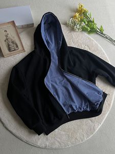 跨境外贸美式复古两面穿蓝格纹拉链卫衣连帽男女短款休闲开衫外套