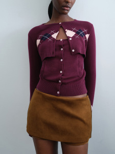 高级感小众绵羊毛针织设计菱格纹开衫吊带上衣撞色复古长袖两件套