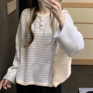 韩系蓝白设计条纹长袖冬季2025新款宽松正肩显瘦毛衣上衣百搭时尚