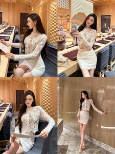 SX善喜法式白色睫毛蕾丝上衣短裙套装气质微透长袖小衫包臀半身裙