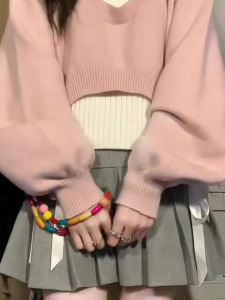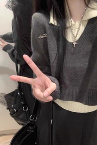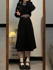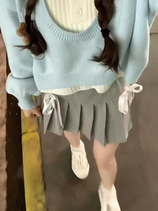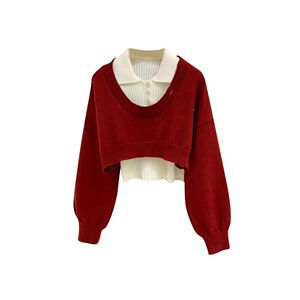 学院风短款韩系毛衣秋高腰两件套针织衫polo领上衣新款女装套装