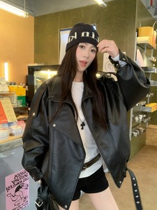 美式复古黑色PU皮长袖外套女装秋季炸街酷炫别致chic宽松夹克上衣