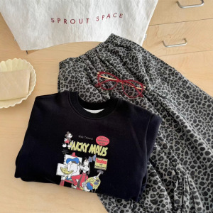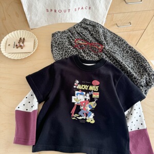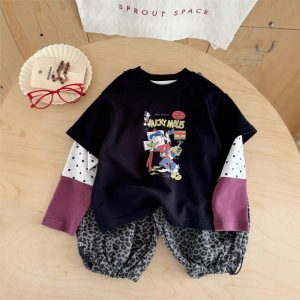 女童套装秋季新款女童韩版休闲卡通印花假两件t恤豹纹长裤两件套