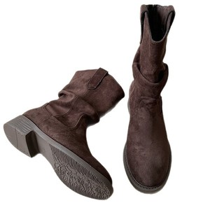 软皮版~复古西部堆堆靴女V口粗跟显瘦中筒靴子骑士靴内增高马丁靴