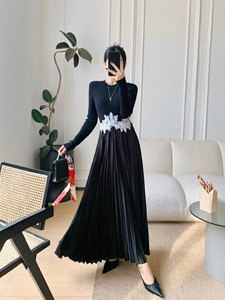 南油高端女装秋冬新款黑色针织拼接蕾丝百褶长裙子修身显瘦连衣裙