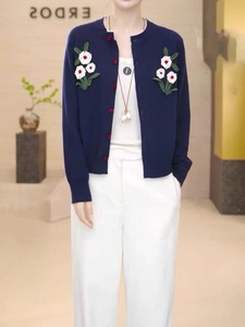 明星同款藏蓝色时尚立体花朵针织开衫25年早秋新款纯羊毛立体钩花